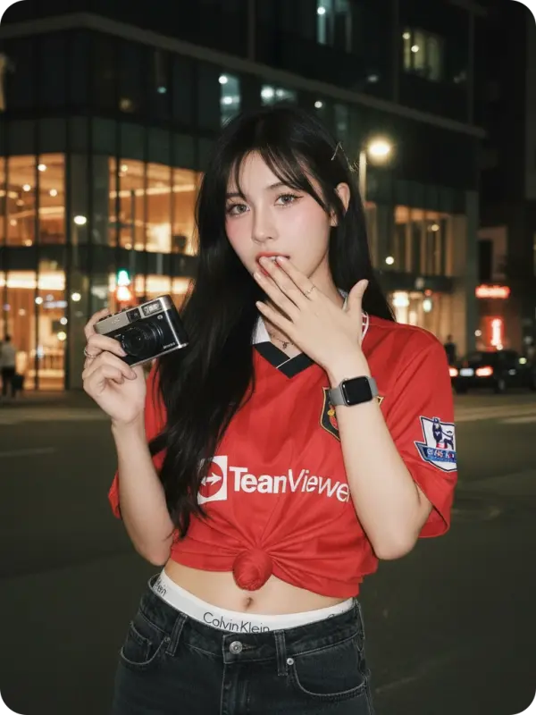 Clothing: A red Manchester United football shirt tied at the side of the waist, dark denim jeans, revealing the navel and waistband of Calvin Klein jeans.