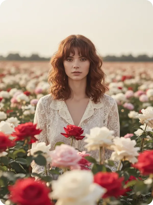 Wardrobe: The subject is wearing a light/cream colored lace blouse. This enhances the vintage, romantic, and ethereal feel of the rose field perfectly.