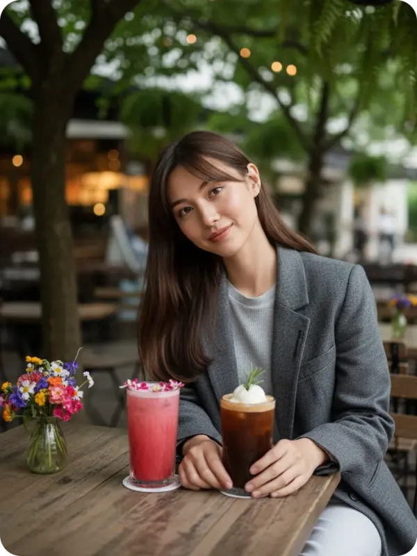 • The background is an outdoor space, similar to a cafe or restaurant with outdoor seating.