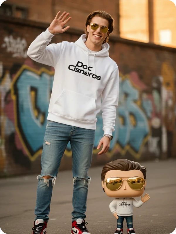 Sudadera blanca con el logotipo “ Doc Cisneros ” en tipografía negra moderna.