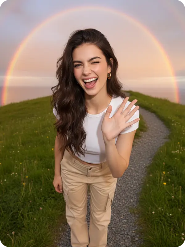 Prompt : High-Angle Outdoor Portrait, Rainbow Sky
