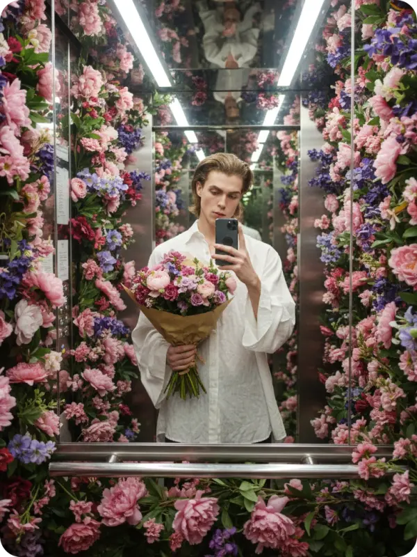 Prompt : Mirrored Bloom: Elevator Selfie & Flowers