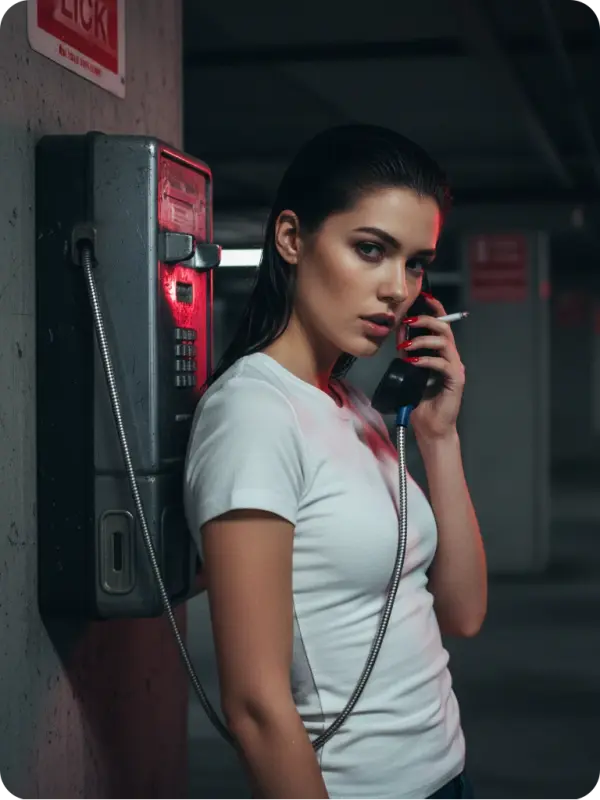 Stage a gritty editorial portrait in a dimly lit parking garage, with a model leaning against a wall-mounted mounted payphone, wearing a tight white shirt . Her hair is slicked back wet, one hand Holding the phone to his left ear, the other holding an unlit cigarette for mood. Use a 50mm lens with shallow depth to blur the industrial background – pipes, concrete, and red signage – while keeping the gloss of her coat and nails tack-sharp. Lighting should be moody and directional, mimicking an emergency exit glow.