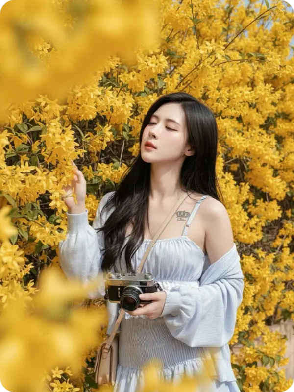 Makeup & Hair: Minimal glowing skin, soft blush, natural lips, subtle eyeliner. Loose, flowing hair in natural waves, catching light. 3 Poses: Sunlit Serenity – Relaxed, head tilted up, eyes closed, basking in sunlight through blooms, peaceful expression, lips faintly parted. Flower-Camera Grace – Holding vintage camera near chest, cardigan slipping off shoulder, soft thoughtful gaze, golden blossoms blurred in foreground. Youthful Bloom – Candid side angle, hand brushing flowers, faint smile, crossbody bag visible, flowers framing figure, shimmering bokeh, emotive body language. Technical: 35mm film lens, shallow depth of field, cinematic high-contrast sunlight, soft pastel highlights, deep shadows. Sharp petal textures, dreamy background blur, luminous skin, subtle film grain.
