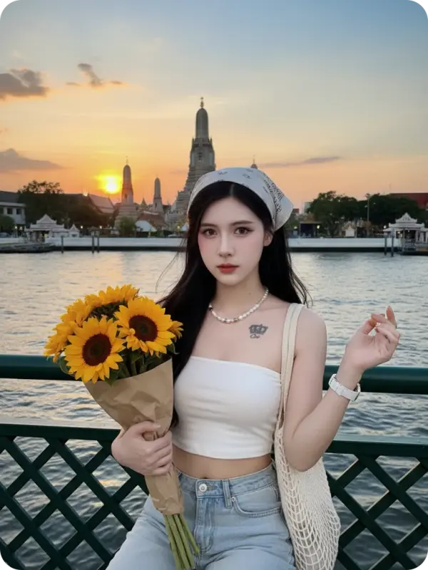 • Background and Atmosphere: The dark green checkerboard bridge railing in the foreground, the Chao Phraya River on one side, and Wat Arun on the opposite bank in the background reflect the golden color of the sunset. The sky is a mix of blue, orange, and pink. The image creates a vibrant, warm, and romantic atmosphere in the evening. (The image matches the original image. 4:3 aspect ratio. Use the attached image above.) • Clothing: A white crop top and light-colored low-rise jeans.