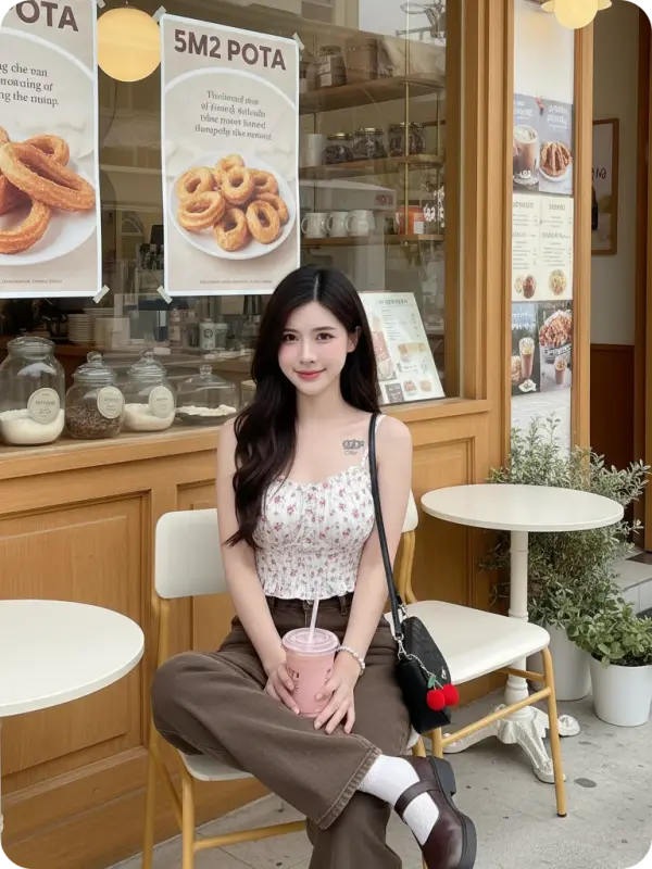 • Woman: Sitting on a chair in front of the cafe, one hand holding a pink plastic drinking glass with a straw, making the desired pose. She smiles sweetly, making the desired pose.